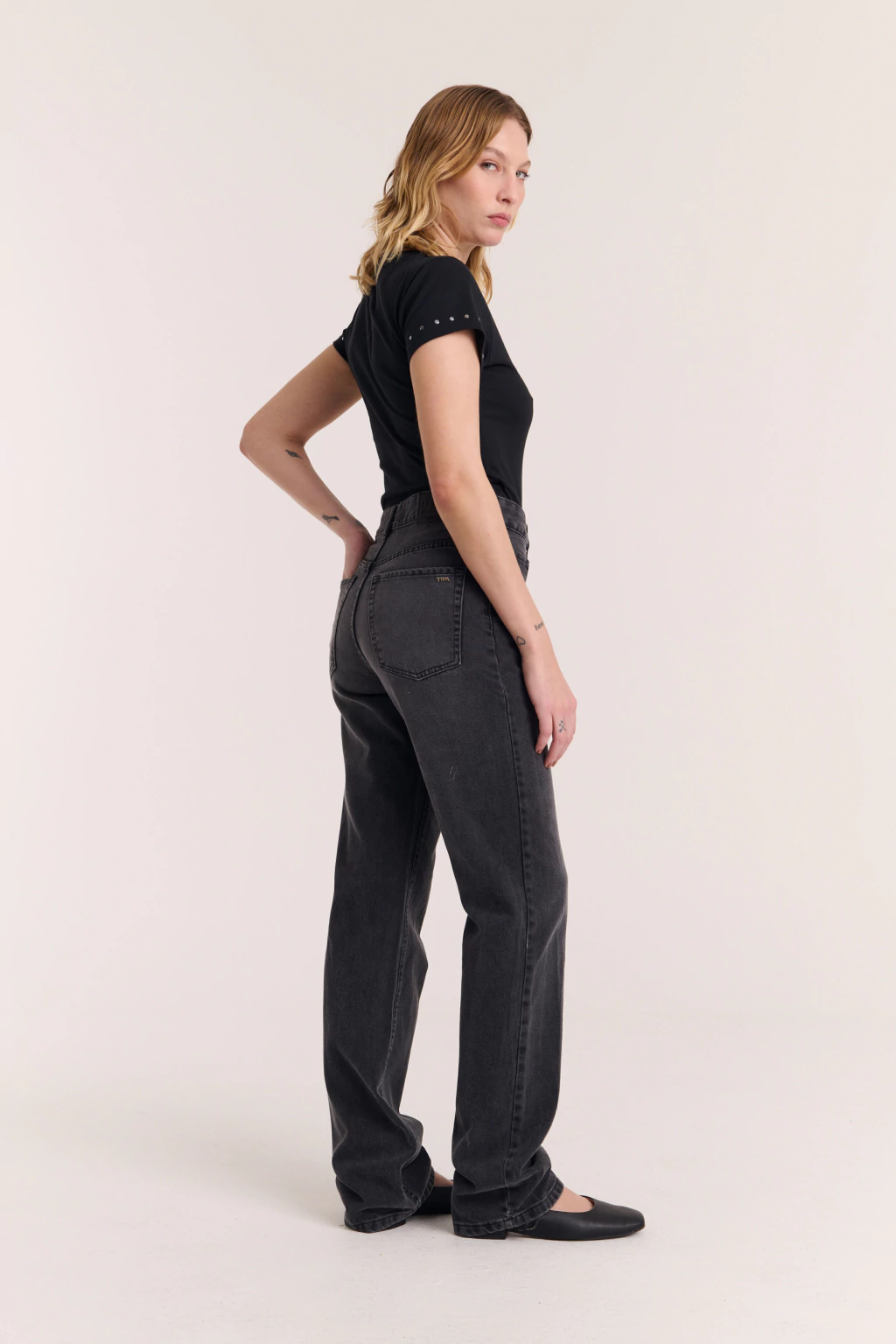 Calce Straight. Jean cinco bolsillos procesado. Tiro medio. Con presillas, metales personalizados y cierre en delantero. Denim rigido. Composición 100% algodon.