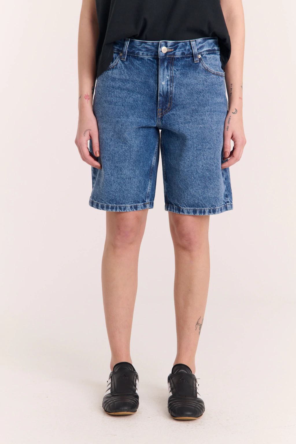 Calce Baggy. Bermuda de jean, cinco bolsillos procesado. Tiro medio, con presillas, metales personalizados y cierre en delantero. Denim rigido. Composición 100% algodón.